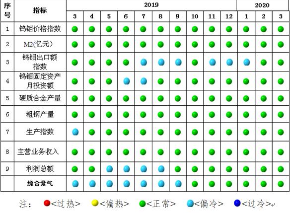 图1 中国钨钼产业月度景气指数趋势图 由中国钨钼产业月度景气信号灯(见图2)可见,2020年3月,在构成钨钼产业景气指数的9个指标中,钨钼价格指数、M2、钨钼出口额指数、钨钼固定资产月投资额、硬质合金产量、粗钢产量、生产指数、钨钼企业主营业务收入及钨钼企业利润总额等9个指标全部处于“正常”区间。值得注意的是,钨钼出口额指数持续上涨,3月份钨钼出口额指数为-50.2;钨钼固定资产月投资额指数较上月略有回落;钨钼利润总额指数持续下降,3月份钨钼利润总额指数为27.3,已接近“偏冷”区间。