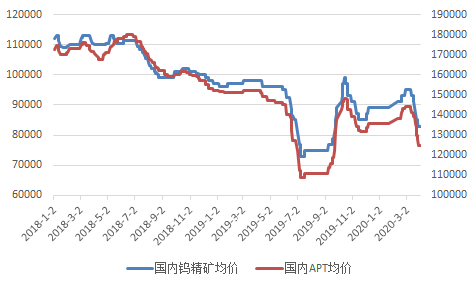 图3 中国钨钼产业合成指数曲线 构成钨钼行业先行合成指数的指标中,经季节调整,环比3升3降。上升的是:钨钼价格指数上升8.3个百分点、M2上升0.4个百分点、钨钼出口额指数上升9.3个百分点。下降的是:钨钼固定资产月投资额下降1.0个百分点、硬质合金产量指数下降11.9个百分点、粗钢产量下降18个百分点。 03 行业情况 (1)价格走势:2020年3月,国内钨精矿均价9万元/吨,同比下降8.1%,环比下降2.5%;APT均价13.7万元/吨,同比下降9.7%,环比下降2.5%。回顾1季度,1月恰逢春节假期价格变化不大,市场上65%黑钨精矿在8.9万元/吨,APT价格在13.7万元/吨左右。进入2月份,疫情影响开始逐步显现,春节假期延长,企业延后复产,交通运输不畅,工人返岗困难,国内正常生产秩序受到一定影响,钨精矿供应偏紧。进入3月,特别是3月下旬以来,钨精矿生产基本正常,但需求迟迟没有恢复,再加上国外疫情严重影响出口,钨价格下跌明显。
