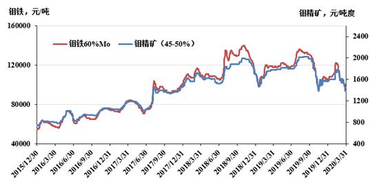 图4 2018-2020年钨产品价格曲线 2020年3月,国内钼精矿平均价格为1520元/吨度,同比下降14.1%,环比下降11.9%;钼铁均价为10.2万元/吨,同比下降13.6%,环比下降12.2%。2020年1季度国内外钼市场经历了持续走高和快速回落两个过程。具体来看,1月至2月中上旬,受春节及国内疫情爆发的双重影响,中国钼原料和钼铁供应紧张推动国内外钼价持续上涨。2月中旬至3月末,疫情快速发展影响终端消费,钼价回落明显。